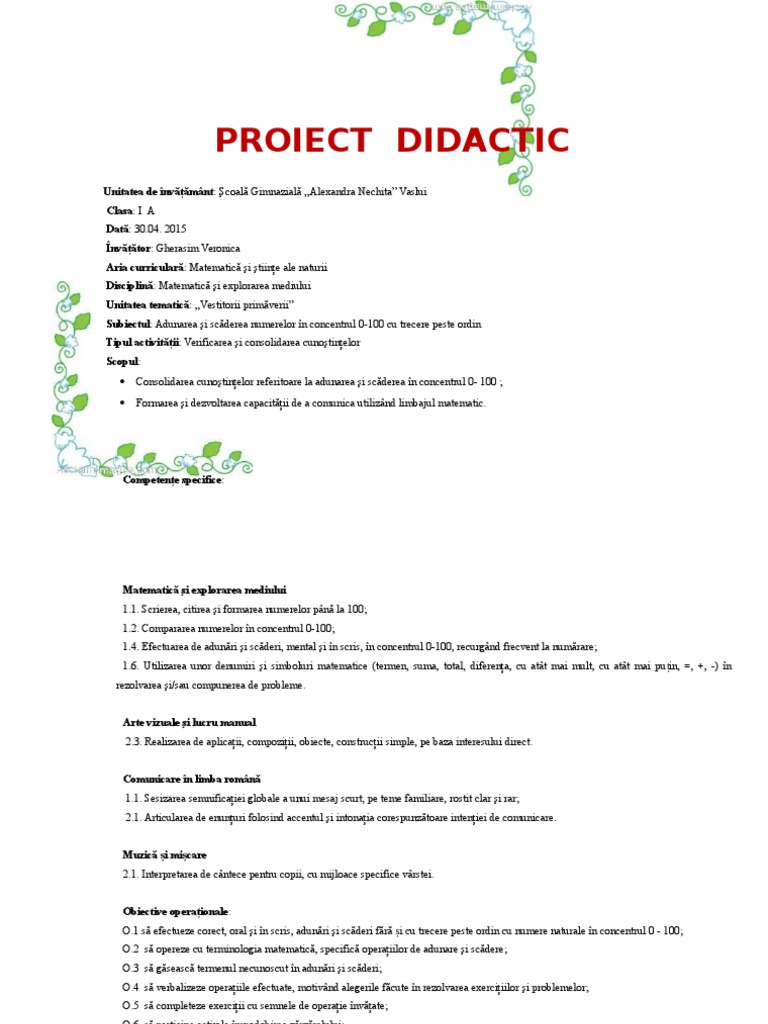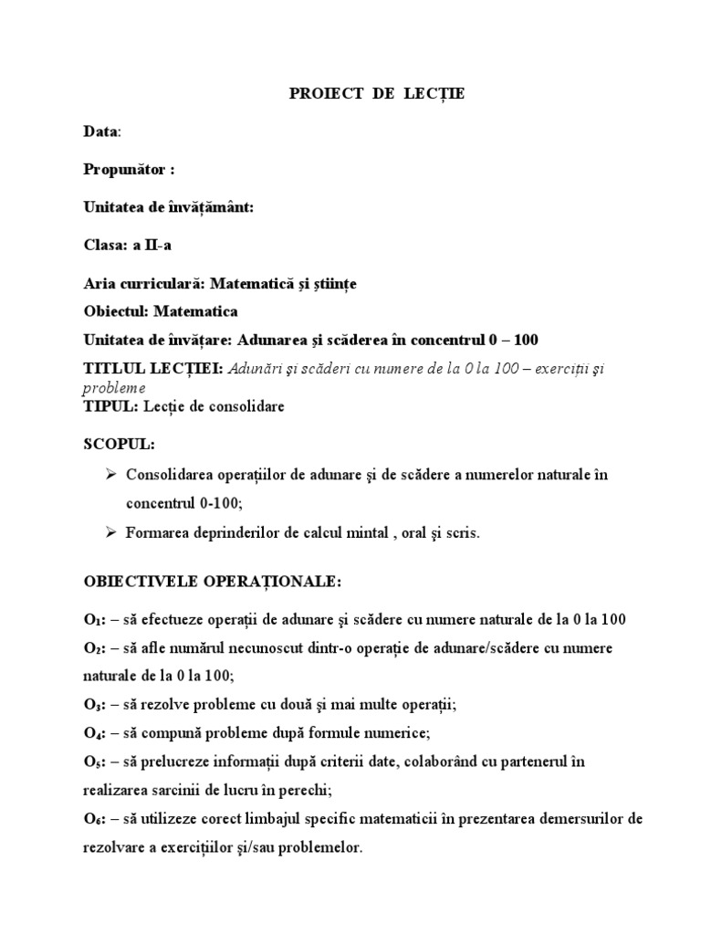 Proiect Didactic Clasa A Ii A Matematica Adunarea Si Scaderea