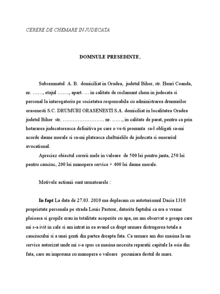 Acte Necesare Depunerea Cerere De Chemare In Judecata Model Md
