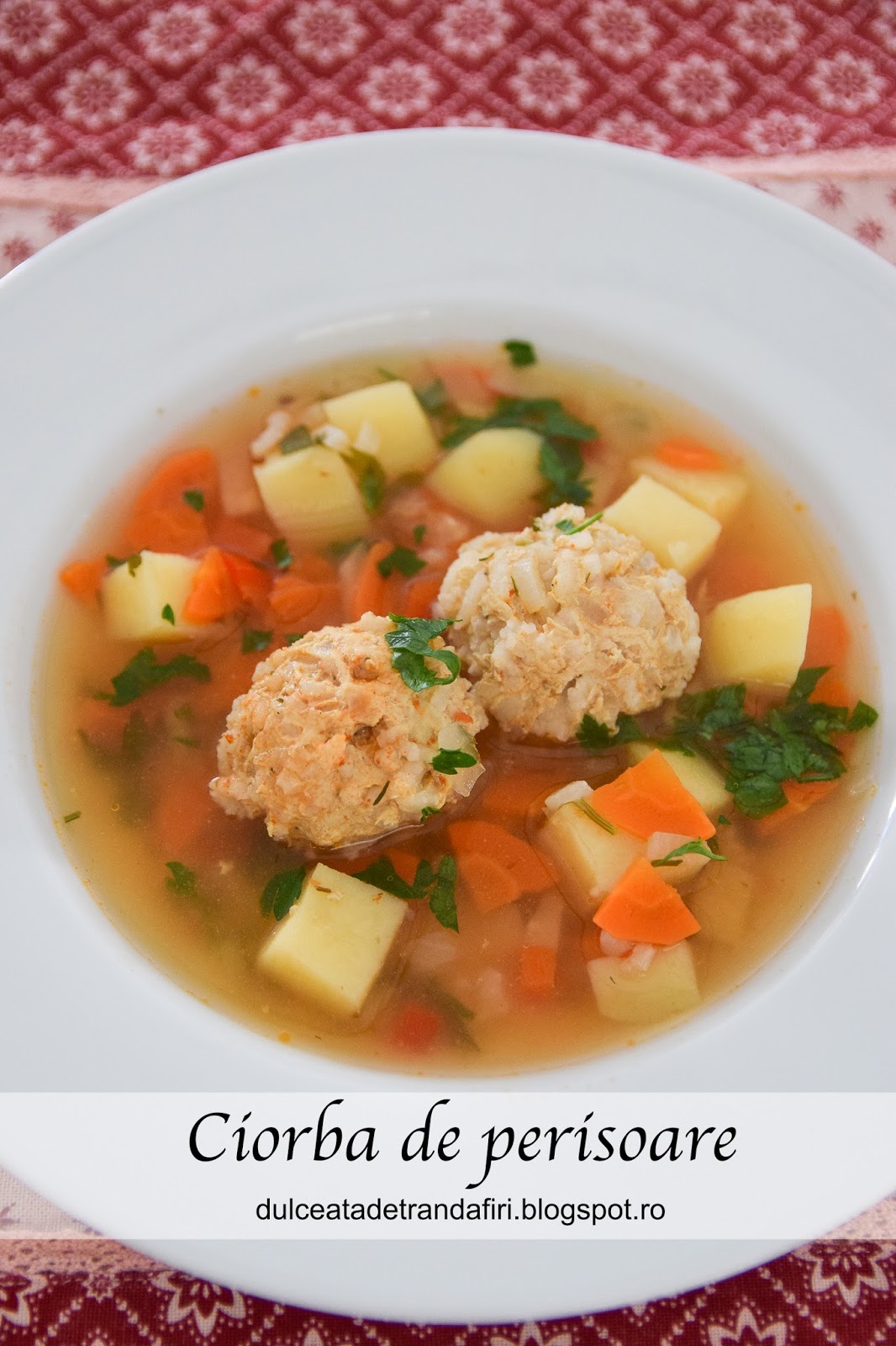 Desi mie imi place si dreasa cu suc de rosii pentru ca toti ceilalti 3 membri ai familiei prefera ciorbele cu smantana ma adaptez si eu. Ciorba de perisoare este una din ciorbele mele preferate. 1 2 legatura patrunjel tocata. Morcovul curatat se da pe razatoarea cu gauri mari si se pune la calit in putin ulei.