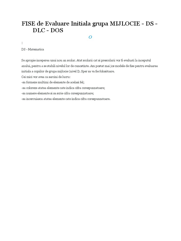 Fise De Lucru Gradinita Fise De Evaluare Initiala Grupa Mijlocie Ds Dlc Dos